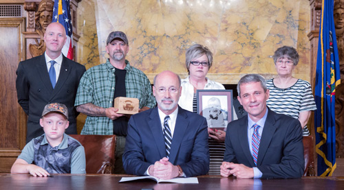 Gov. Tom Wolf signed into law legislation authored by Rep. Rob Kauffman that will place stronger penalties on individuals who endanger children in their care. Joining them for the public bill signing were Franklin County District Attorney Matt Fogal (standing, left); Heath’s parents, Mark and Shelly Ryder (standing, center); Heath’s brother, Aiden (seated at the table); and Heath’s grandmother, Deb Lebeau (standing, right).
