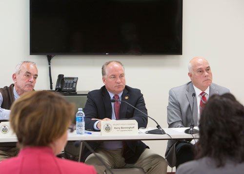 | Members of the House Republican Policy Committee listen to testimony on the Central Pennsylvania Food Bank during an informational meeting in Williamsport. Shown here are Reps. Garth Everett (R-Lycoming/Union), Kerry Benninghoff (R-Centre/Mifflin) and Jeff C. Wheeland (R-Lycoming,), who served as host for the meeting. |