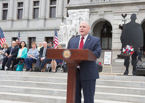 HARRISBURG – Positioned in front of a flag line, color guard, over a dozen veterans advocates and the silhouette of Army Spec. Michael Wargo, Rep. Doyle Heffley (R-Carbon) addressed veterans and their supporters on the Capitol steps Tuesday afternoon. Heffley’s