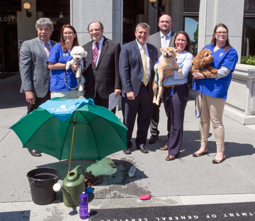 Lawmakers and animal rights advocates teamed up for a recent press conference urging support for legislation to protect pets left unattended in a hot car. The Motor Vehicle Extreme Heat Protection Act passed the House of Representatives Friday. Pictured (from left) are Rep. Dom Costa (D-Allegheny); Mary Jane McNamee, JD, VMD, the Pennsylvania Veterinary Medical Association; Sen. Andy Dinniman (D-Chester); Rep. Frank Farry (R-Bucks), author of the Motor Vehicle Extreme Heat Protection Act; Kristen Tullo, Pennsylvania state director, the Humane Society of the United States; Megan Baylor, CVT, the Pennsylvania Veterinary Medical Association; and (back row) Adrian Tindell, roadside assistance manager, AAA Central Penn.