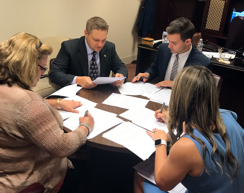 Rep. Aaron Bernstine (R-Beaver/Butler/Lawrence) and his staff work Wednesday to draft, edit and file 79 amendments to two pieces of anti-gun legislation which were passed out of the House Judiciary Committee Tuesday and Wednesday in an effort to protect the Second Amendment rights of Pennsylvania citizens.